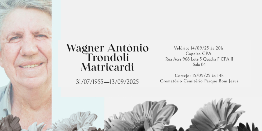 Com profundo pesar, a Adufmat-Ssind comunica o falecimento do professor aposentado Wagner Antônio Trondoli Matricardi, ocorrido na sexta-feira, 12/09. A cerimônia de despedida está sendo realizada na sala 04 da Capela do CPA (R. Acre, 968, Lote 5, Quadra F - bairro CPA II), e o cortejo está marcado para esta segunda-feira (15), às 14h, rumo ao Crematório do Cemitério Parque Bom Jesus.