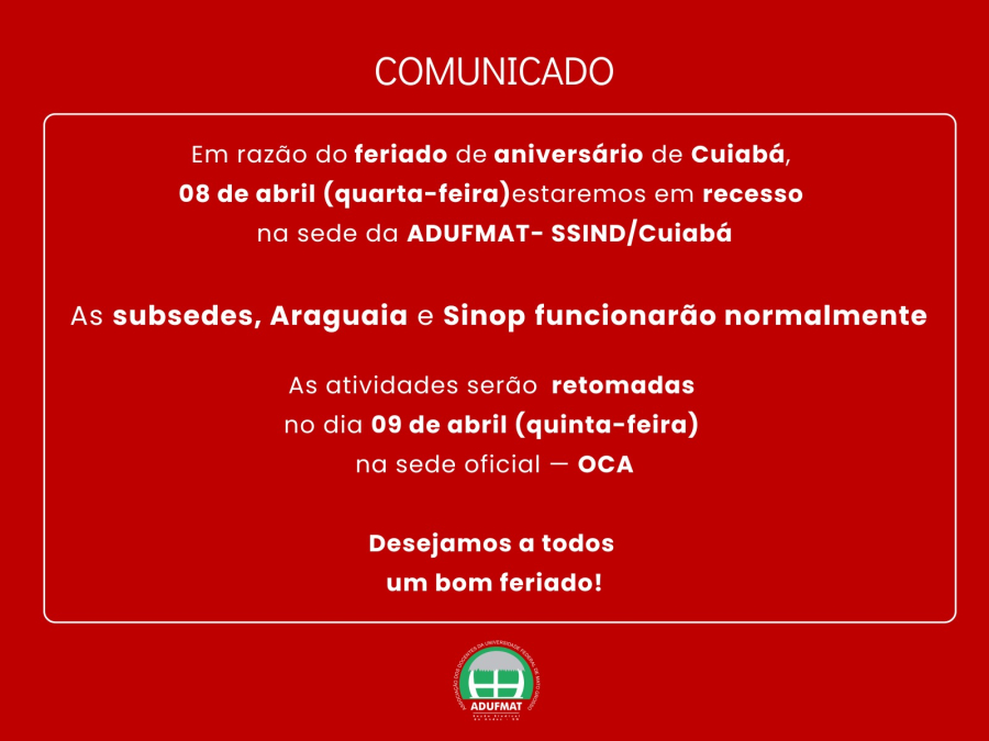 COMUNICADO: não haverá expediente na sede, em Cuiabá, na quarta-feira, 08 de abril