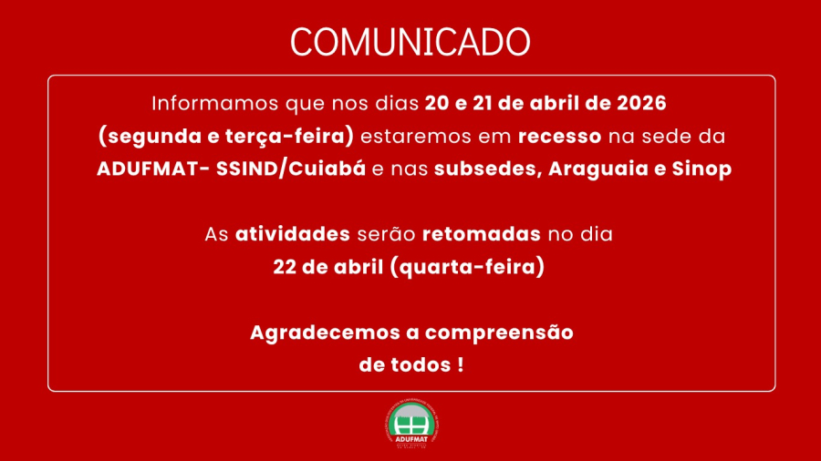 A Adufmat-Ssind informa que, em razão do feriadodo de Tiradentes, dia 21/04, não haverá atendimento ao público na sede e nas subsedes do sindicato também no dia 20/04.