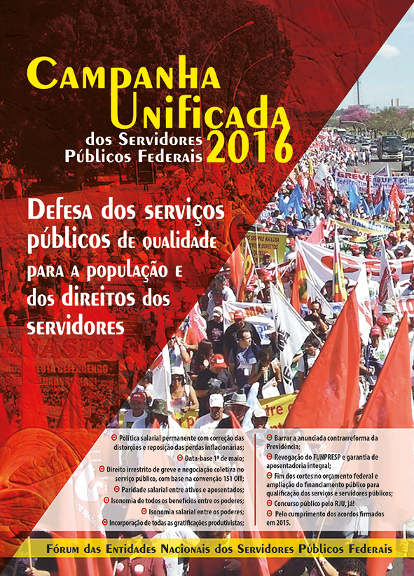 Estamos encaminhando o cartaz da campanha unificada do Fórum das Entidades Nacionais dos Servidores Públicos Federais, a pauta protocolada no MPOG e a carta entregue às lideranças da Câmara dos Deputados.