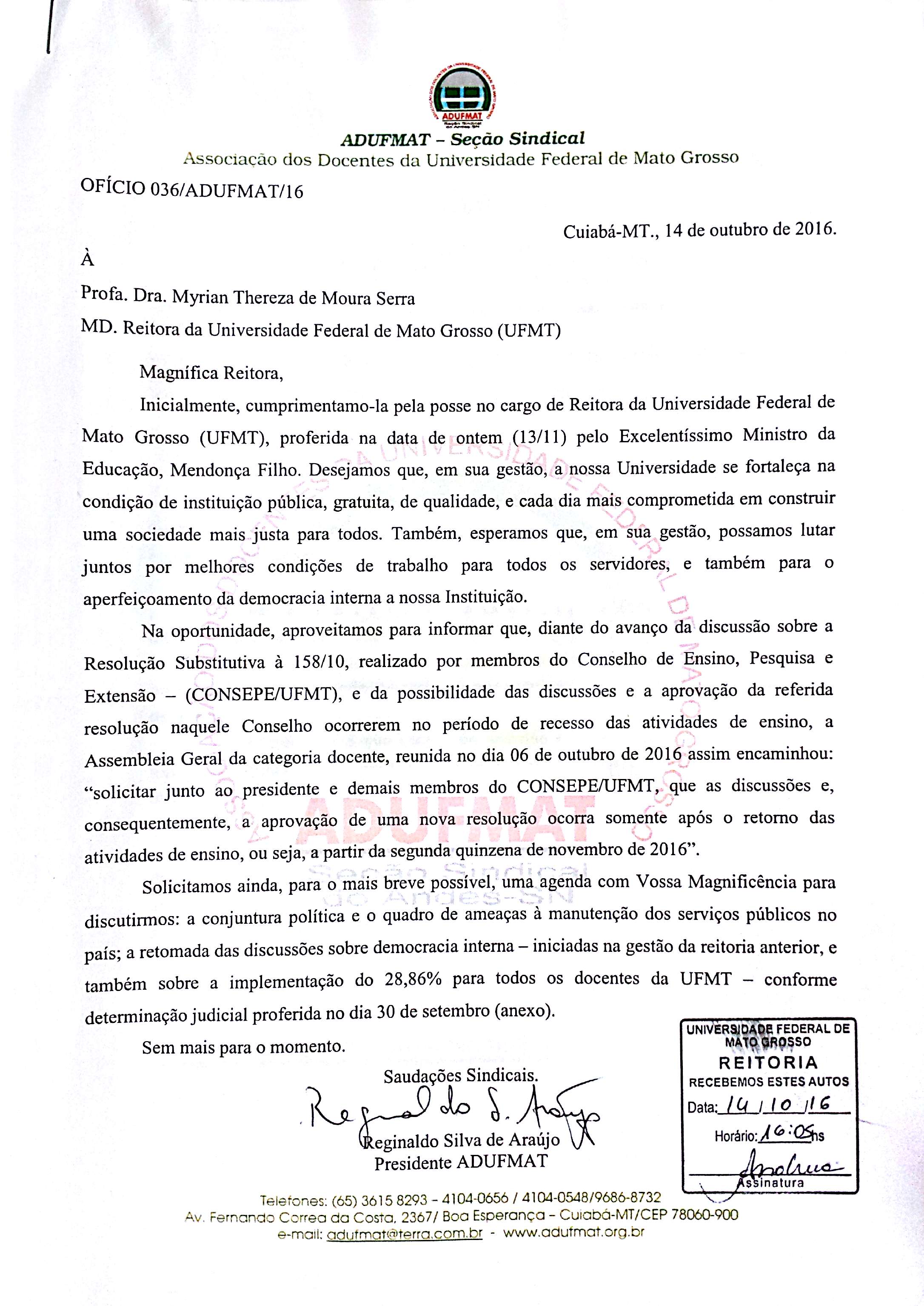 Confira, abaixo, a íntegra do ofício entregue à nova administração da UFMT (também disponível para download no arquivo anexo abaixo):
