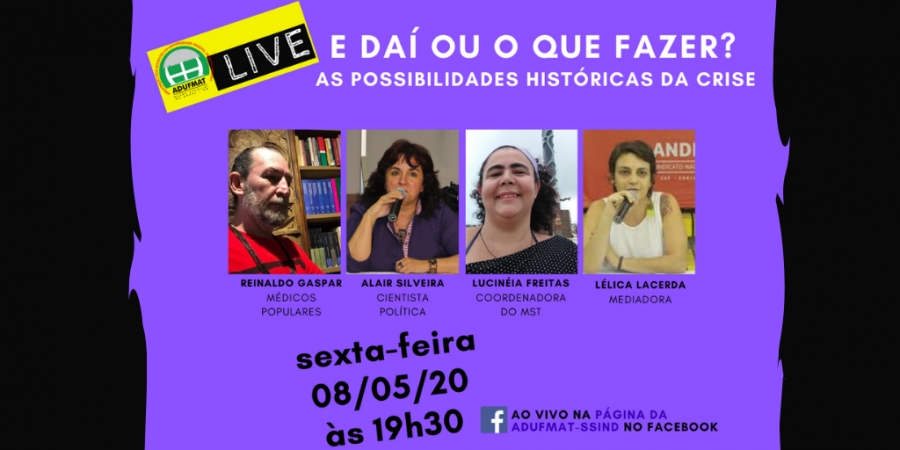 Nessa sexta-feira, 08/05, a live da Adufmat-Ssind convida o médico Reinaldo Gaspar, a cientista política Alair Silveira e coordenadora do Movimento dos Trabalhadores Rurais Sem Terra, Lucinéia Freitas, para debaterem diferentes concepções de sociedade e, consequentemente, maneiras de como lidar com a pandemia. A mesa "E daí ou O que fazer? As possibilidades históricas da crise" terá início às 19h30, na página oficial do Facebook da Adufmat-Ssind.