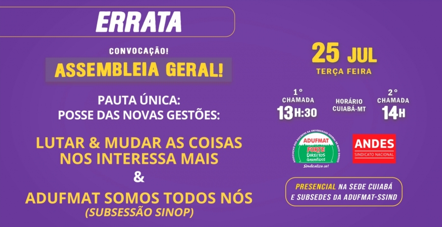 EDITAL DE CONVOCAÇÃO PARA ASSEMBLEIA GERAL ORDINÁRIA DA ADUFMAT- Ssind - 25/07/23 (terça-feira), às 13h30
