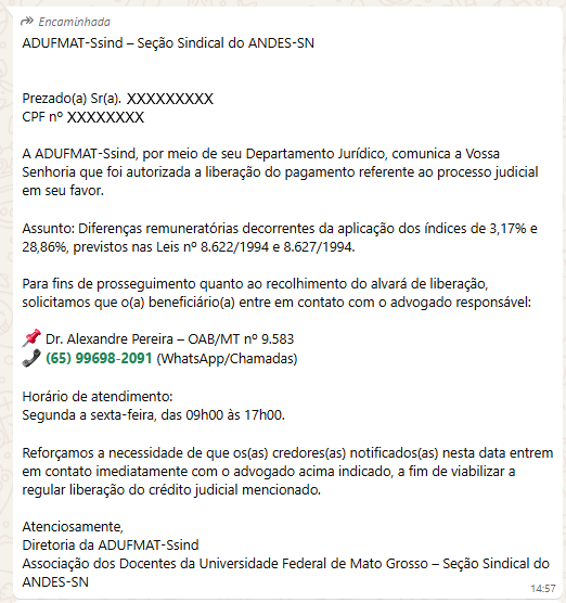 A Adufmat-Ssind alerta, mais uma vez, que golpistas estão utilizando o nome e logo do sindicato para entrar em contato com docentes, afirmando que processos de interesse da categoria estão com pagamento liberado. A abordagem é sempre a mesma: os criminosos indicam um processo real, contato de um advogado de nome conhecido (nem sempre é o responsável pelo processo), indicando telefone e até o número da OAB. Ocorre que, mais uma vez se trata de golpe!