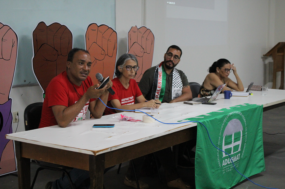 O diretor-geral da Adufmat-Ssind iniciou este ponto de pauta falando sobre as investidas contra a Palestina, o avanço do imperialismo estadunidense, que também está voltado para a América Latina. A precarização do trabalho em todos os âmbitos e a Reforma Administrativa, isto é, a destruição de direitos, são demonstrações disso.