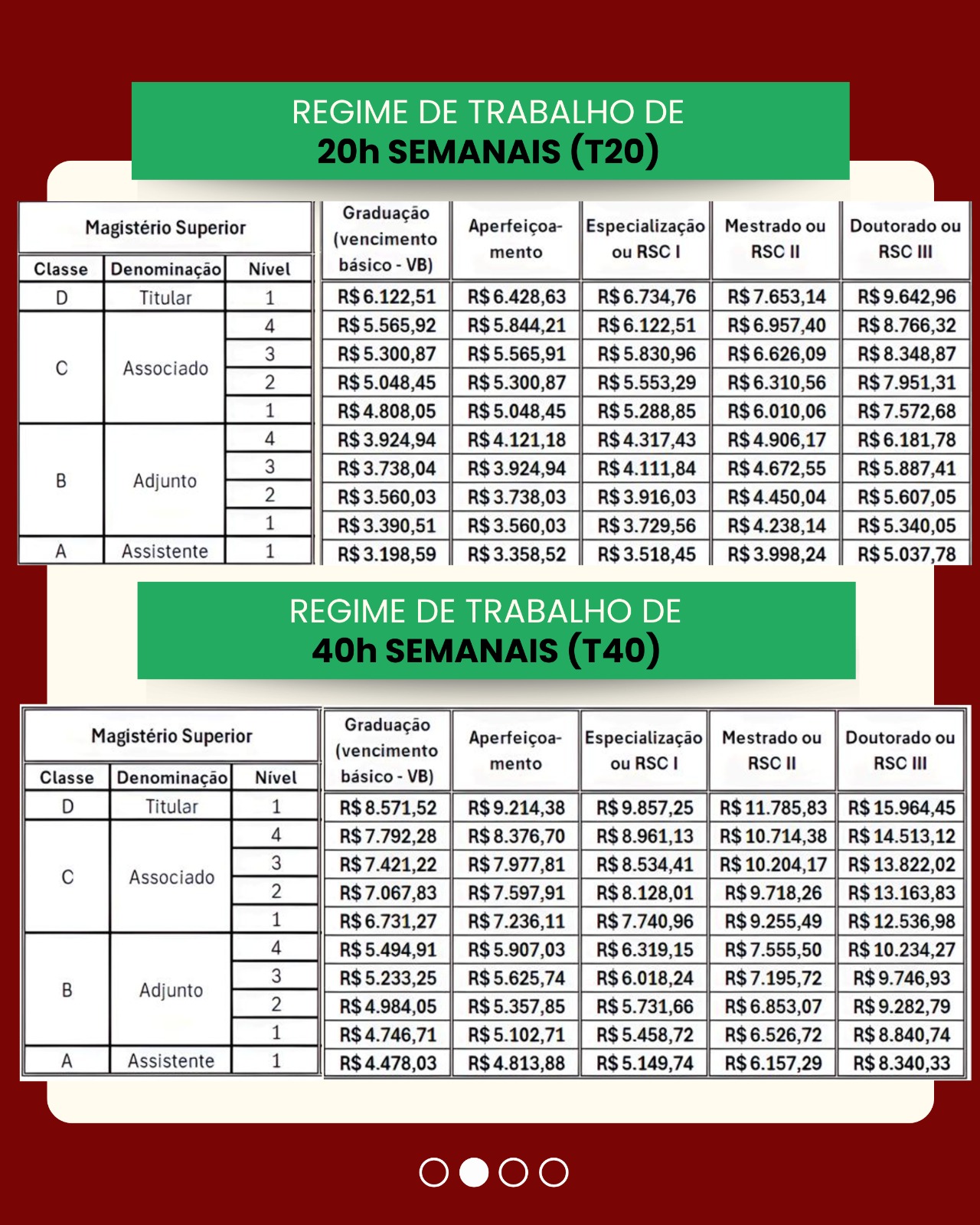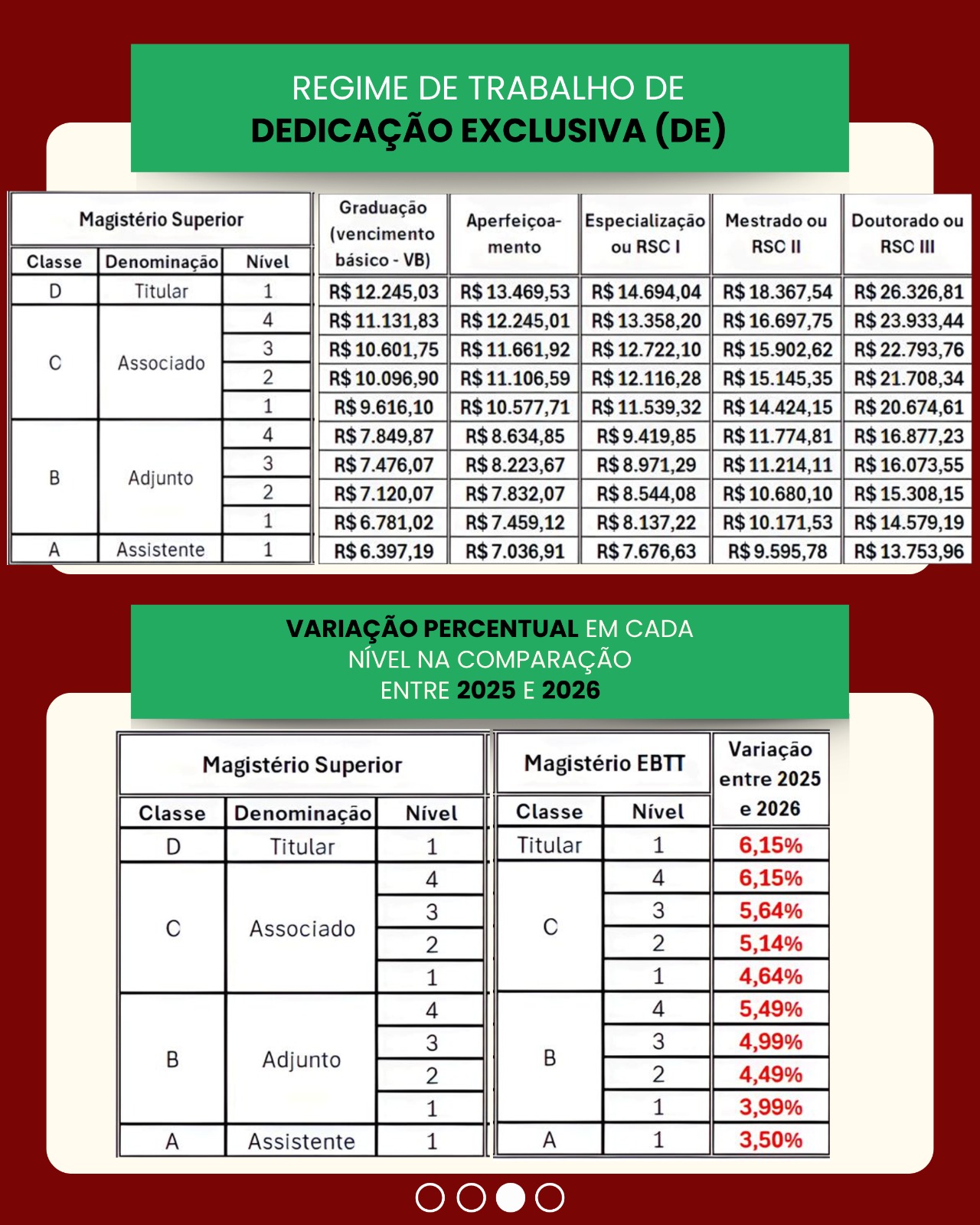 Conforme acordo da última greve da categoria, realizada em 2024, a segunda parcela de aumento e atualizações nos steps das carreiras do Magistério Superior (MS) e da Educação Básica, Técnica e Tecnológica (EBTT) da Rede Federal será implementada a partir do salário de abril de 2026, pago em maio.