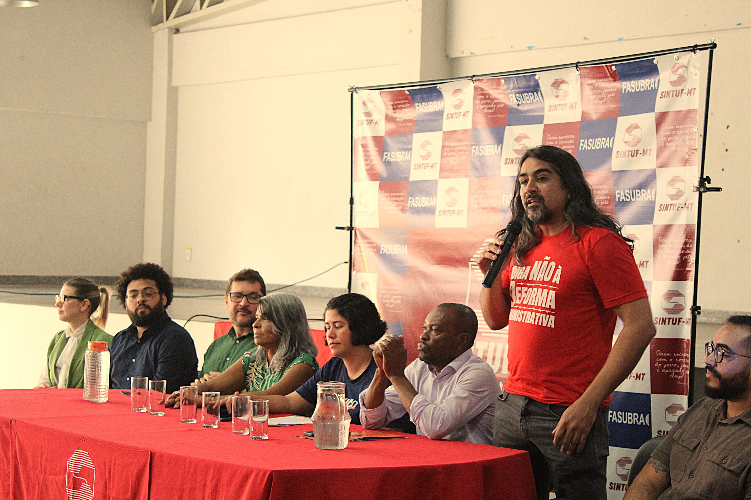 Após a saudação, permaneceram os representantes sindicais para fazer o debate. O presidente da CUT em Mato Grosso, Henrique Lopes, abriu sua intervenção alertando que a proposta de carreira divulgada pelo governo em 1º de dezembro não é um simples ajuste administrativo, mas parte de um pacote maior de alterações que “mexem em mais de 40 artigos da Constituição, inclusive o artigo 5º, núcleo duro dos direitos sociais”.