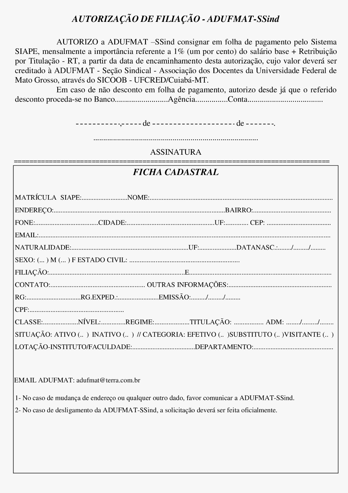 Para se associar, faça o download da ficha de filiação, preencha, assine e envie para a Adufmat-Ssind por e-mail (O endereço de e-mail address está sendo protegido de spambots. Você precisa ativar o JavaScript enabled para vê-lo.) ou entregue pessoalmente na sede do sindicato.